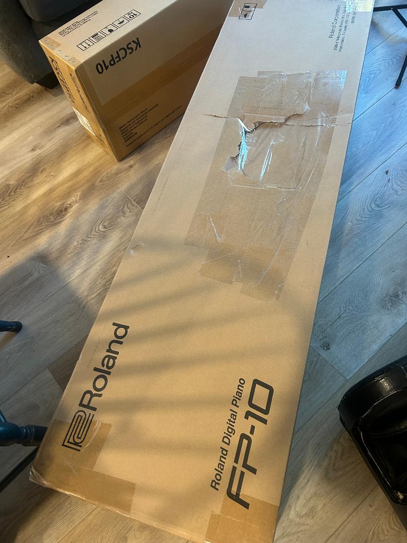 Outside boxes are damages but inside pianos are perfect and come with full Roland warranty